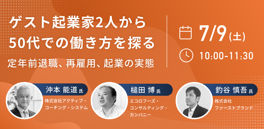 ・50代の働き方のいま ・起業ストーリーその1:沖本能道/株式会社アクティブ・コーチング・システム ・起業ストーリーその2:槌田博/エコロフーズ・コンサルティング・カンパニー ・パネルディスカッション、質疑応答 ・オンラインサロン「50歳からのエイジレスキャリア塾」について
